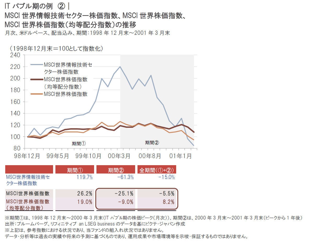 なお、ITバブル崩壊時に、MSCI世界株価指数の構成銘柄を時価総額を基準とせず、全ての構成銘柄を均等に保有していた場合(MSCI世界株価指数(均等配分指数))には、ITバブル崩壊時の同指数の下落率は相対的に小幅に抑えられました。時価総額の大きさにかかわらず、全ての銘柄を均等に保有したことで、銘柄の分散効果がより高まり、時価総額の大きな銘柄の値動きの影響を軽減することができました。また、その後の回復も相対的に早く、ITバブル崩壊という難局を比較的うまく乗り越えていくことができたと言えます。