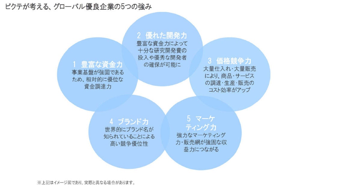 当ファンドは、高い競争優位性をもつグローバル優良企業の株式に投資を行っています。ピクテでは、グローバル優良企業には5つの強みがあると考えています。