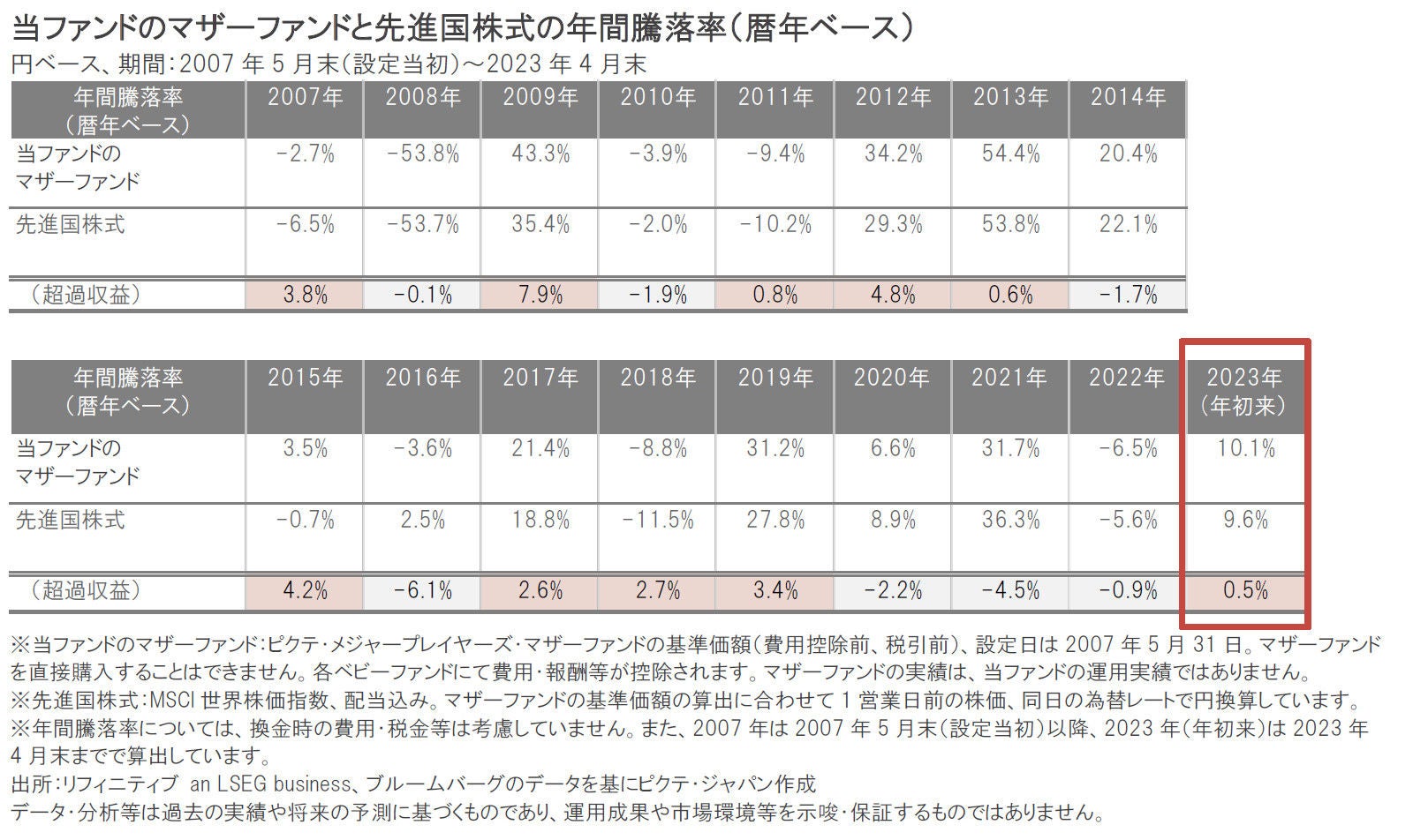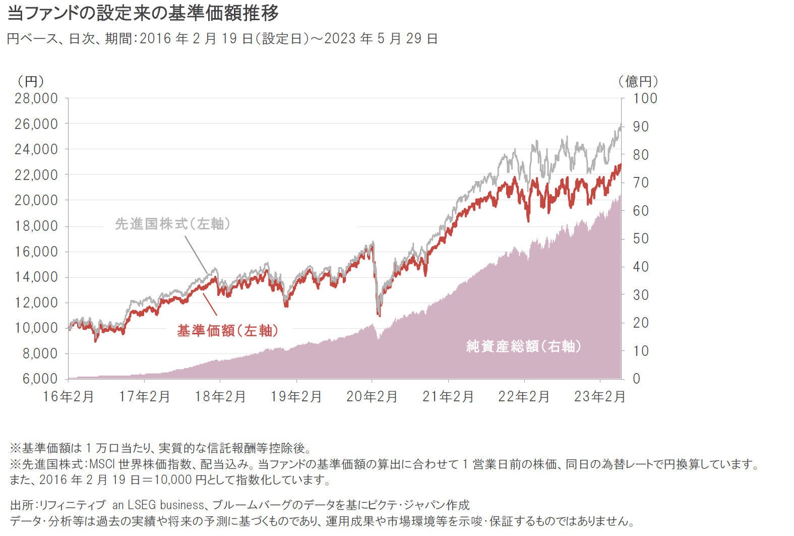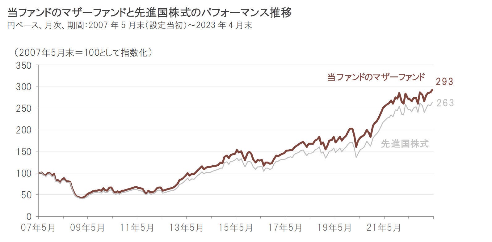 また、2023年年初来の当ファンドのマザーファンドの基準価額は、先進国株式(MSCI世界株価指数、配当込み、円換算ベース)をやや上回る上昇率となりました(2023年4月末時点)。
