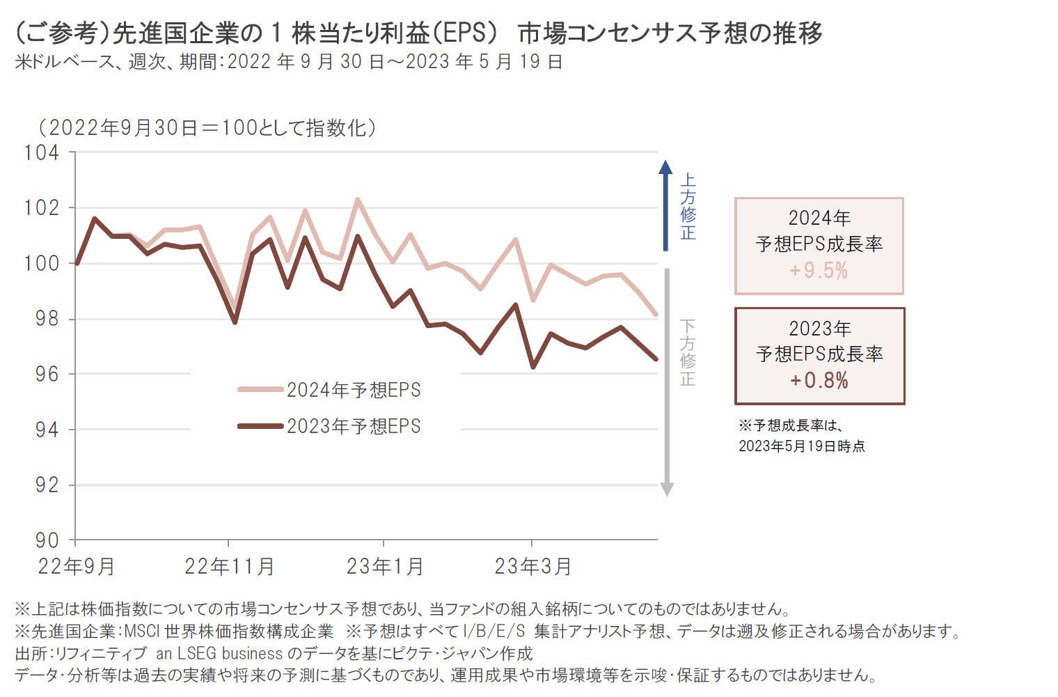 前述の通り、世界経済の先行き不透明感は依然として払拭されていません。また、企業利益については、2023年1-3月期の決算発表に先立って市場コンセンサス予想は大きく下方修正されていました。このため、実際の決算発表では、厳しい事業環境であるにもかかわらず大手ハイテク関連などの企業は、市場コンセンサス予想を上回る決算内容を示しました。今後についても市場コンセンサスでは増益が予想されていますが、これは世界経済の減速がなければということが前提となります。
