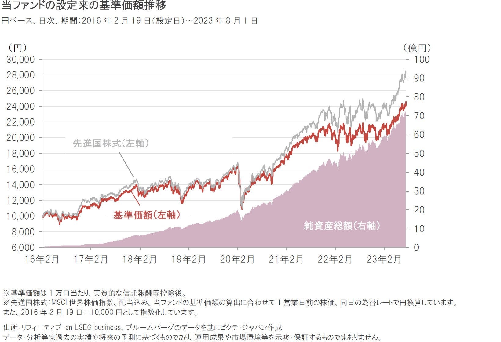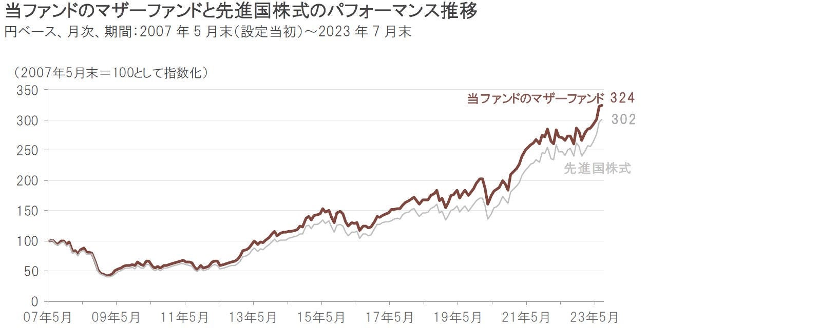 前述の通り、2023年年初来の当ファンドのマザーファンドの基準価額は上昇しているものの、先進国株式(MSCI世界株価指数、円換算)の上昇率を下回っています。