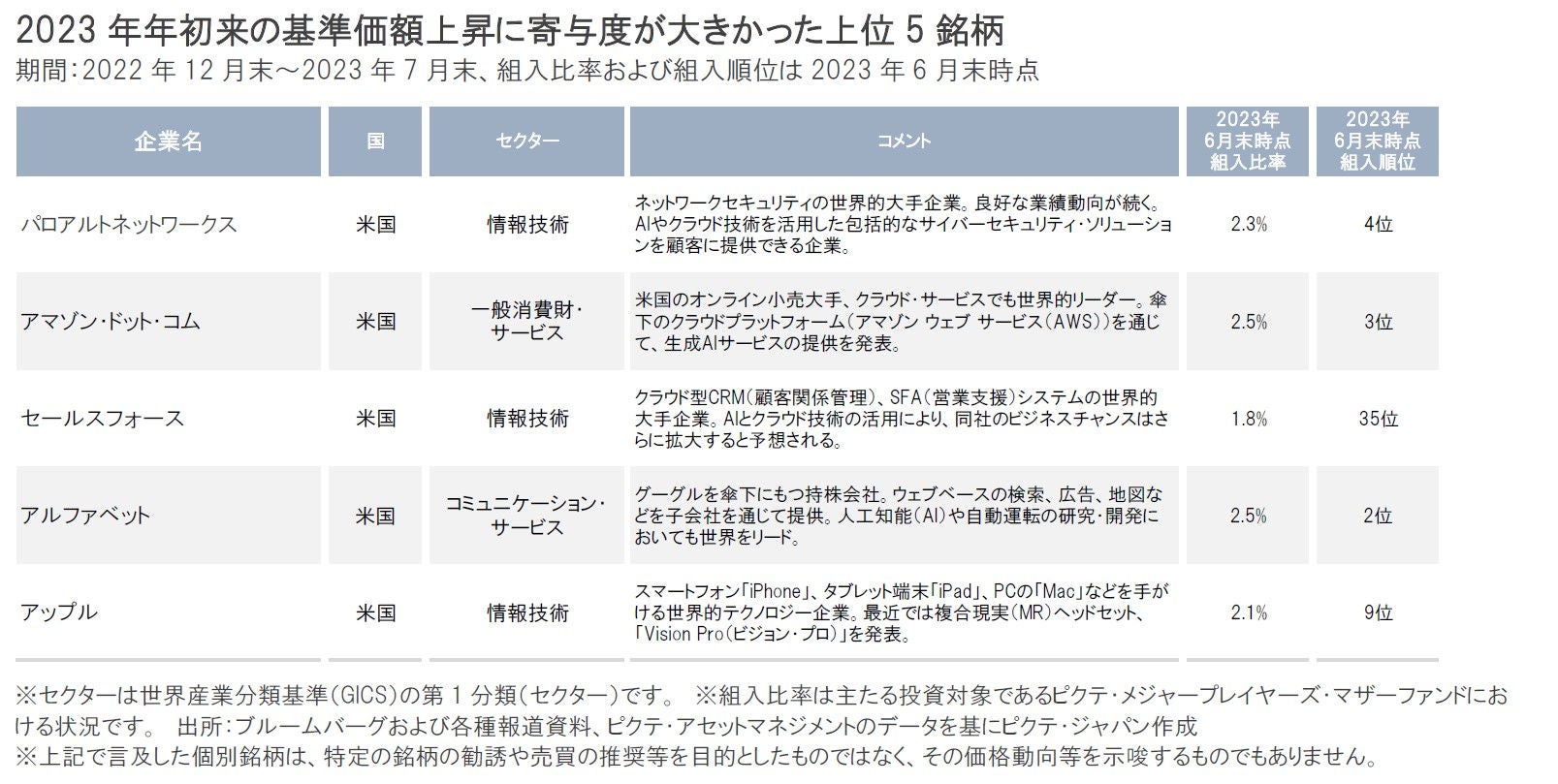 こうした市場環境下、2023年年初来の当ファンドのマザーファンドの基準価額も、2022年(年間)の下落から上昇に転じ、2023年年初来、足元(2023年7月末)までで+21.9%の上昇となりました。また、当該期間の当ファンドのマザーファンドの基準価額の上昇に大きく貢献した主な銘柄の多くは、AI関連の一角をはじめとしたテクノロジー関連銘柄となりました。