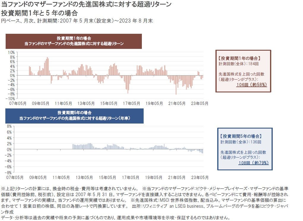 例えば、当ファンドのマザーファンドの設定来(2007年5月末)から足元(2023年8月末)までの期間で、投資期間を1年とした場合の当ファンドのマザーファンドのリターンと、先進国株式のリターンと比べてみます。1年間という短い投資期間では、計測回数(全体)184回のうち、当ファンドのマザーファンドのリターンが先進国株式を上回った(超過リターンがプラス)回数は106回(全体の約58%)にとどまりました。