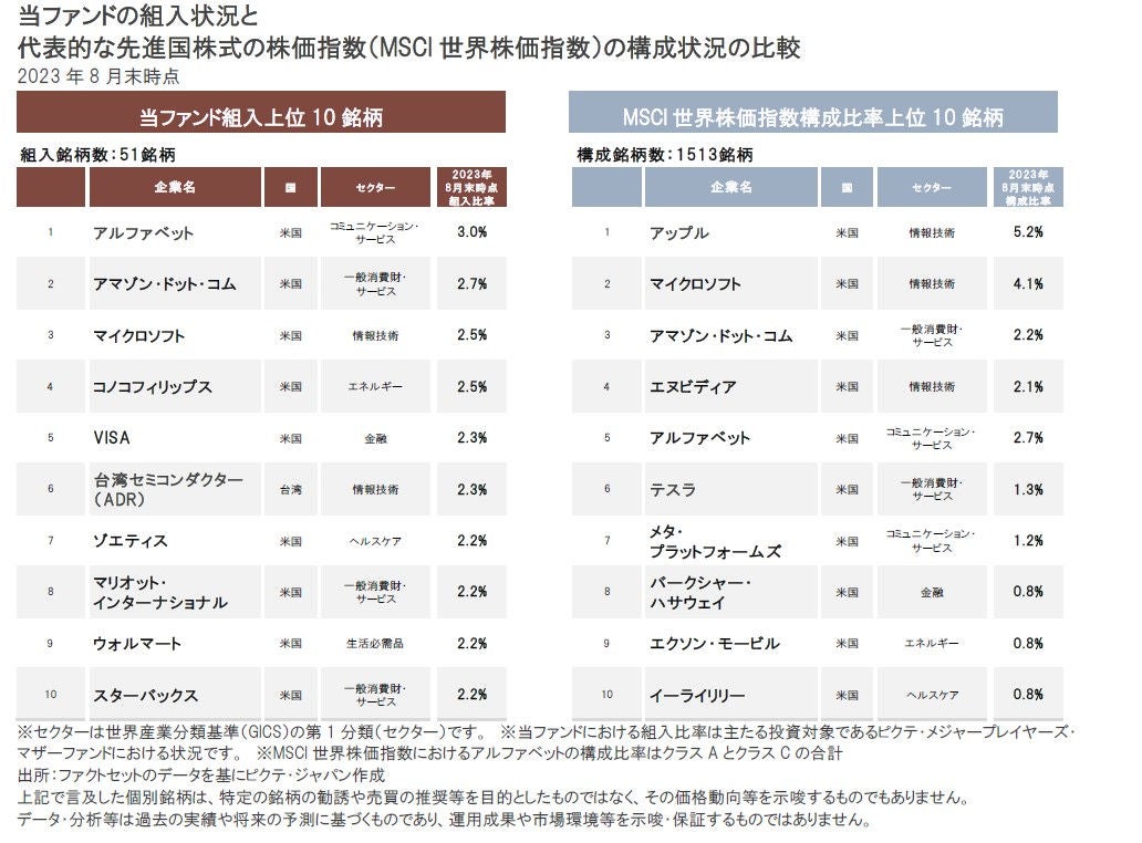 当ファンドは、世界の企業の中から、運用チームによる個別企業の丹念な調査・分析に基づき、高い競争優位性をもつグローバル優良企業を選別した上で投資を行っていくアクティブ・ファンドです。また、運用に際しては、特定の銘柄に大きく偏ることがないよう、組入比率の調整も行っていく方針です。