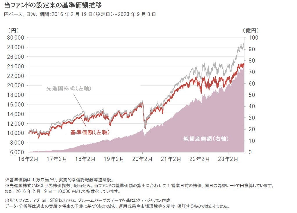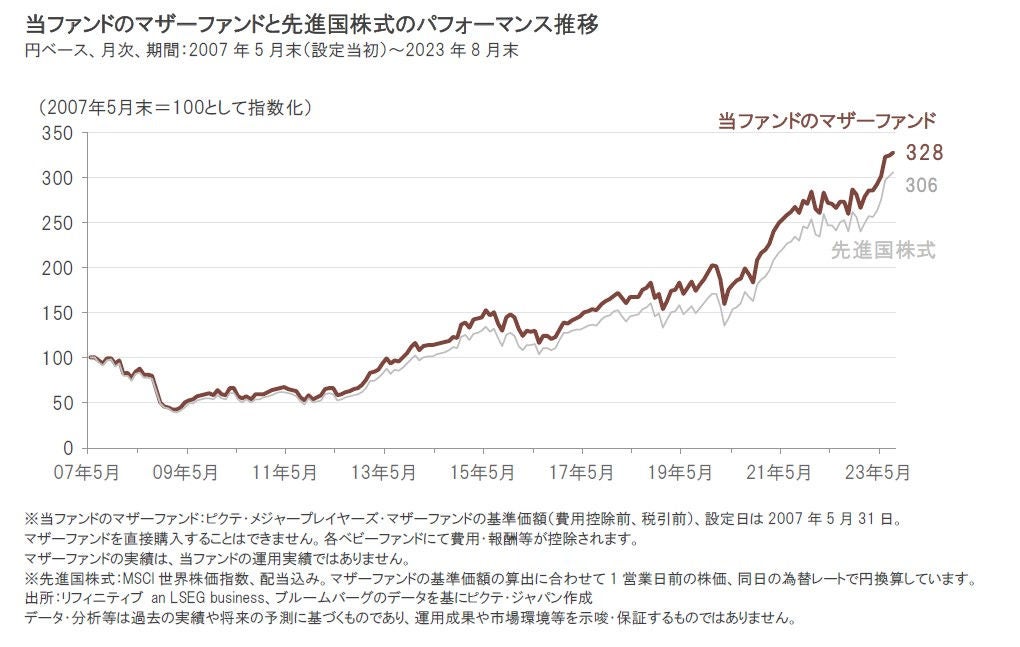 当ファンドのマザーファンドの設定来(2007年5月末)のパフォーマンスは、足元(2023年8月末)までの16年超の期間でみると、先進国株式(先進国株式の市場平均、以下同様)を上回って上昇しています。