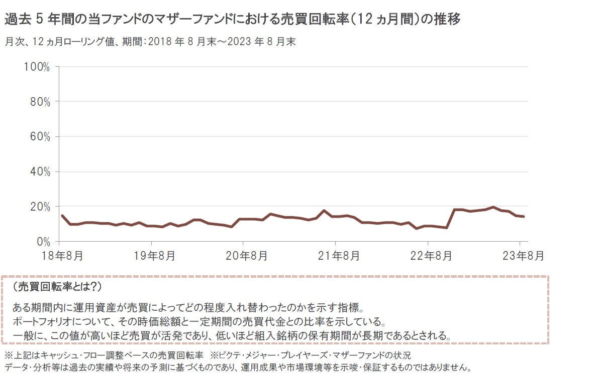 過去5年間の当ファンドのマザーファンドにおける売買回転率の状況をみると、ポートフォリオの中身が12ヵ月(=1年)間に入れ替わった割合は概ね20%以下にとどまりました。