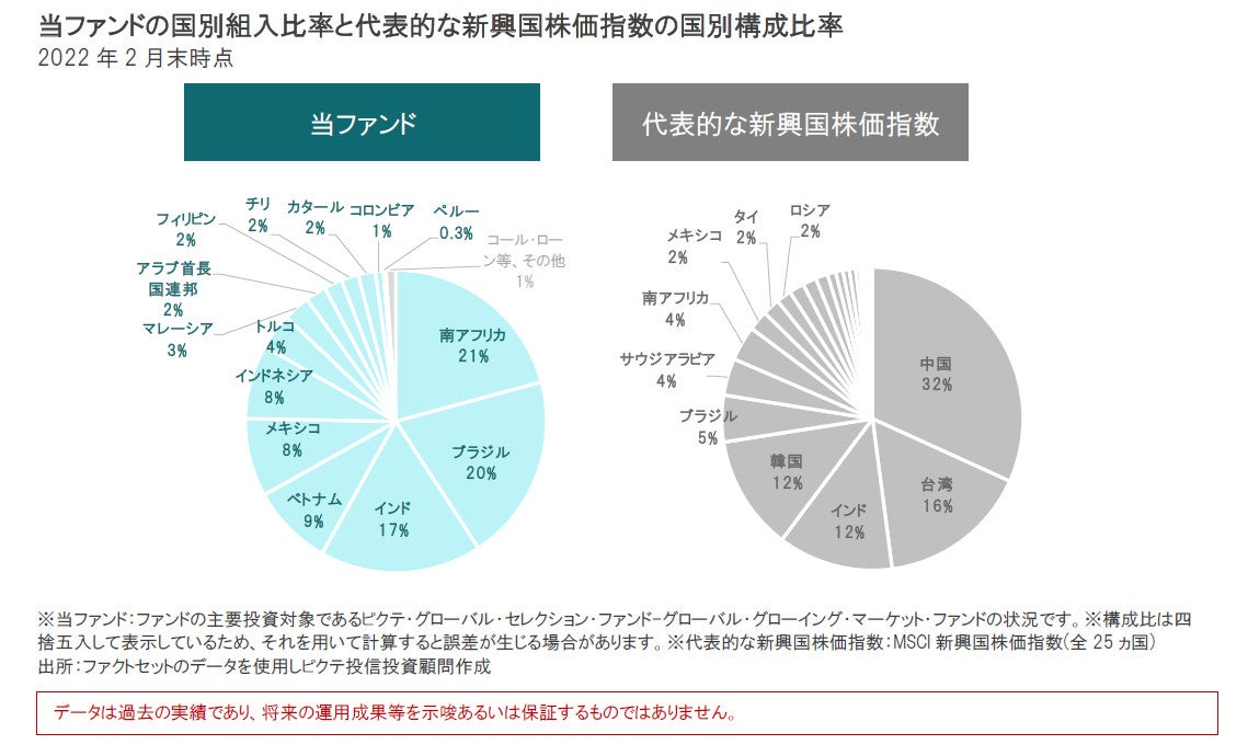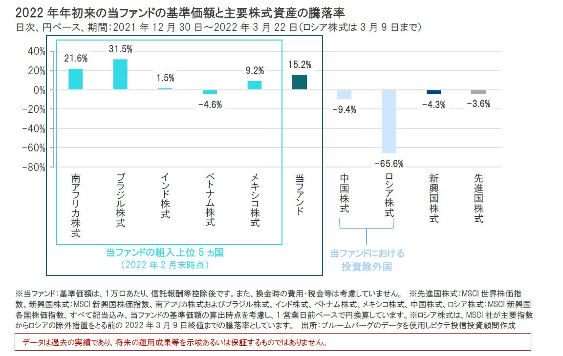 新興国の中でも、労働人口増加国の企業の株式へ投資を行う当ファンドでは、組入上位国に南アフリカやブラジルなどの資源国が名を連ねています(2022年2月末時点)。こうしたことがプラス材料となり、当ファンドの基準価額は2022年年初来で、新興国株式全体の動きとは異なり、相対的に底堅い推移を示しています。