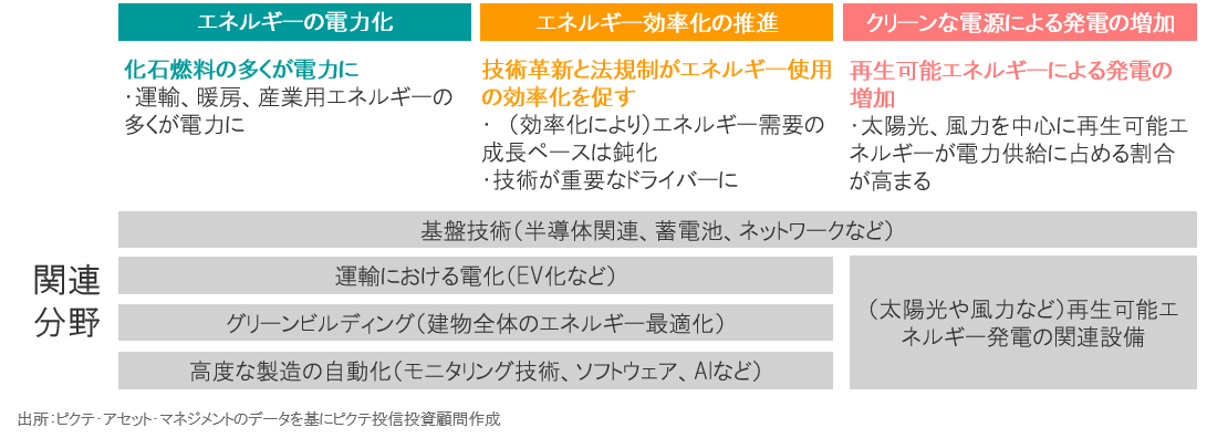 これらの3点が進むにはテクノロジーの進化が欠かせず、共通の基盤技術として半導体や蓄電池、ネットワークなどの分野が重要になります。また、「エネルギーの電力化」や「エネルギー効率化の推進」では自動車やトラック、列車などの電化や燃費の効率化、オフィスビルや商業施設などのグリーンビルディング化、AI(人工知能)やセンサー/カメラなどを駆使したより高度な製造の自動化が、「クリーンな電源による発電の増加」については風力発電や太陽光発電などの再生可能エネルギー関連設備の建設がすすめられることになります。