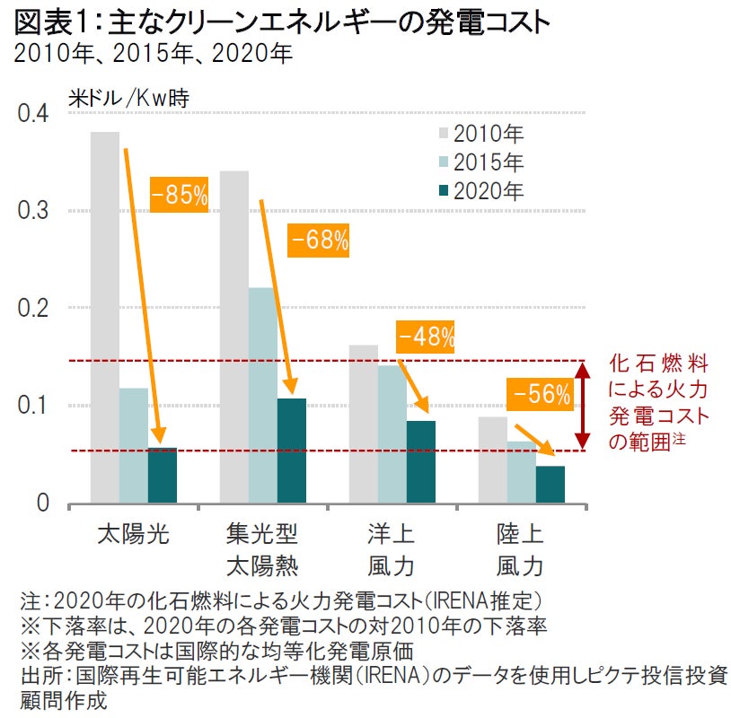 エネルギー転換によってクリーンエネルギーの普及が進むと、化石燃料の供給が制限されることで化石燃料の価格が上昇し、インフレ要因となるのではないかという懸念があります。しかしクリーンエネルギーは過去10年間で大幅にコストが低下し、化石燃料による発電と遜色ない水準となっています(図表1参照)。