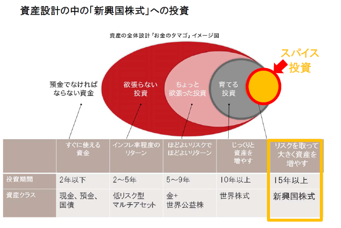 資産設計の中で、新興国株式への投資の位置づけは「スパイス投資」と考えられます。このため、長期スタンスで投資できる資産の一部で運用することが重要です。