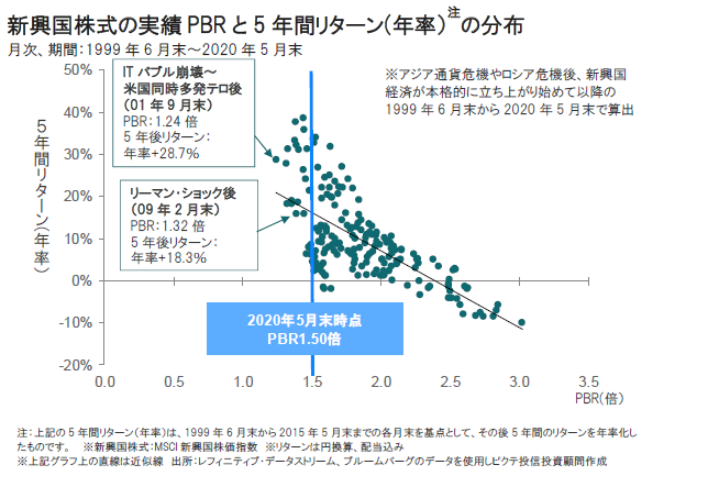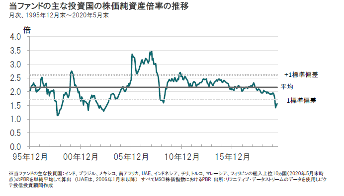 新型コロナウイルスの世界的な拡大の中で、世界的な株安局面で当ファンドの投資対象である新興国の労働人口増加国の株式市場も下落しましたが、足元では反発しています。当面は新興国における感染拡大状況や経済情勢など懸念される材料もありますが、株式のバリュエーションの観点からは、株価純資産倍率(PBR)などが全体的にみると過去平均を下回る魅力的な水準にあります。