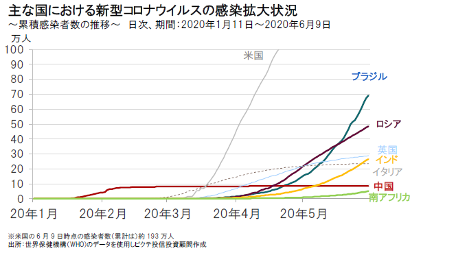 ただし、足元では懸念材料もあります。新型ウイルス感染拡大状況について、欧米での拡大ペースは緩やかになっているとの見方ですが、ブラジルをはじめとした南米地域や、その他新興国での感染拡大が加速していることは気がかりです。