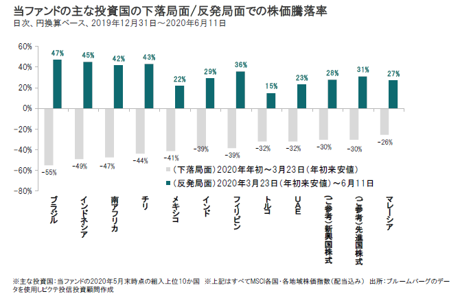 当ファンドでは新興国の中でも労働人口が増加している国の株式に投資をおこなっていますが、こうした国の中には資源国や経済のファンダメンタルズが相対的に弱いとみられる国もあり、それらの国の株式市場および通貨は下落局面で大幅な下落となりましたが、反発局面では大幅回復しています。