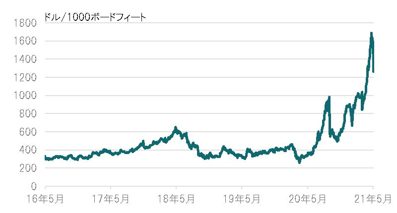米シカゴ市場の木材先物価格は、2020年3月末から4月のはじめにかけて300ドル(1000ボードフィートあたり)を割り込む水準まで下落しましたが、それ以降は上昇基調となり、2021年5月7日には1,686ドルまで上昇しました。