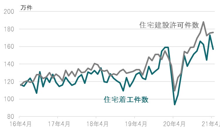 木材市場については、コロナ禍で在宅勤務の広がりなどにより住宅への需要が高まったことが木材価格高騰の要因となっています。米国の住宅市場は、足元では木材価格の上昇やサプライチェーンの逼迫などが影響し4月の住宅着工件数は前月比で減少していますが、住宅建設許可件数は小幅ながら前月から上昇しており、全体的にみると住宅への需要は高い水準で推移していると考えます(図表2参照)。