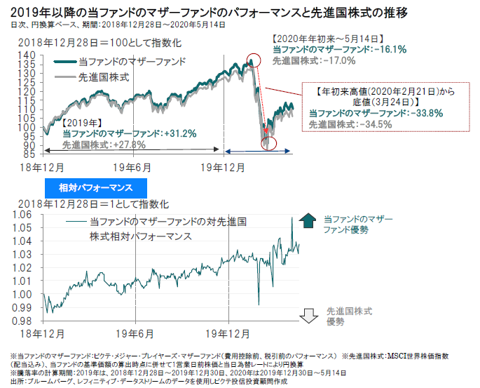 こうした2020年年初来の市場環境下、グローバル優良企業の株式に投資を行う当ファンドのマザーファンドのパフォーマンスは先進国株式に比べると相対的な底堅さを示しています。特に、年初来の高値(2020年2月21日)から直近底値(3月24日)までの急落局面の下落率が相対的に抑えられたことが寄与しています。
