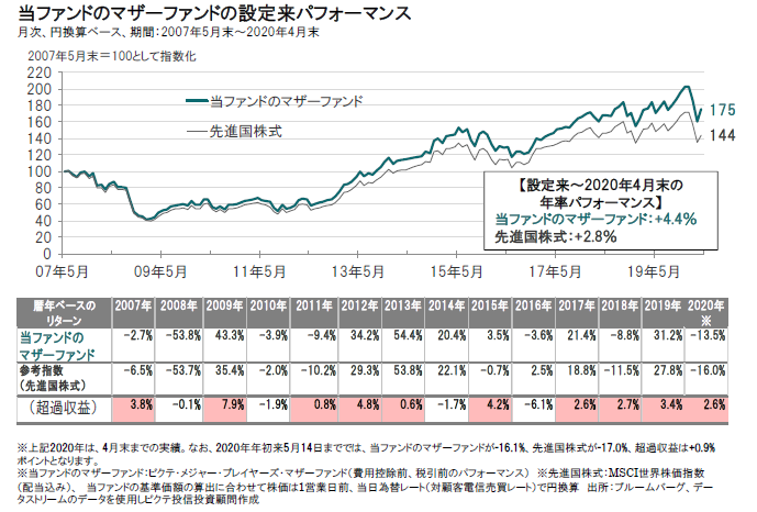 実際に、当ファンドのマザーファンドのパフォーマンスでは、設定来(2007年5月末)以降、暦年ごとに区切ってみると、リーマン・ショック後の金融危機(2009年)、欧州債務危機・世界経済成長鈍化など(2012年)といった困難な局面で、先進国株式に比べて相対的な強さを発揮しました。そして、先進国株式に対して相対的に劣勢となった局面(2008年、2010年、2014年、2016年)もありましたが、設定来でみると、相対的に好パフォーマンスを示しました。