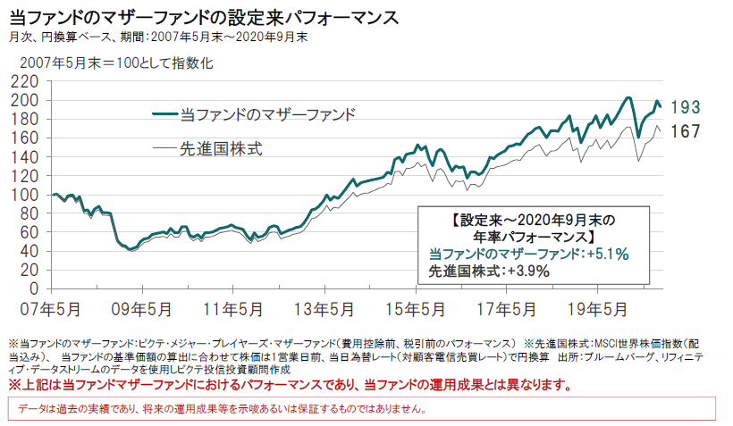 当ファンドは、主にグローバル優良企業の株式に投資を行っています。当ファンドのマザーファンドの設定来(2007年5月31日設定)以降の約13年超の期間(~2020年9月末まで)でみると、当ファンドのマザーファンドのパフォーマンスは、先進国株式の平均(MSCI世界株価指数、配当込み、円換算べース)を引き続き上回る良好な実績となっています。