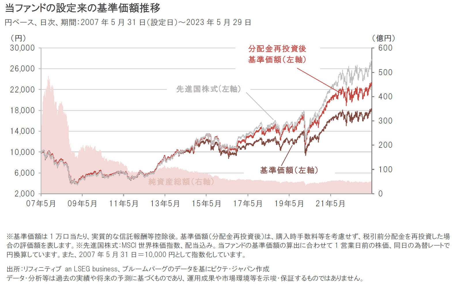また、2023年年初来の当ファンドのマザーファンドの基準価額は、先進国株式(MSCI世界株価指数、配当込み、円換算ベース)をやや上回る上昇率となりました(2023年4月末時点)。