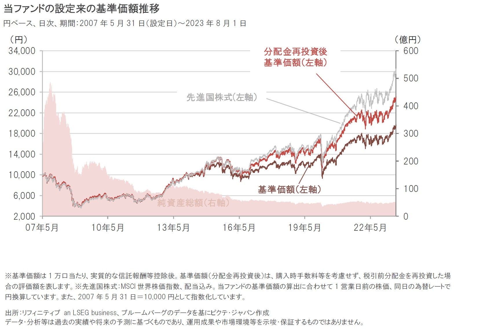 前述の通り、2023年年初来の当ファンドのマザーファンドの基準価額は上昇しているものの、先進国株式(MSCI世界株価指数、円換算)の上昇率を下回っています。