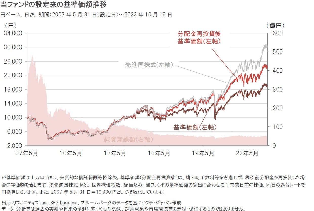 こうした市場環境下、2023年年初来、9月末まで(計算期間:2022年12月末~2023年9月末)の当ファンドのマザーファンドの基準価額は、主要通貨に対して円安が進行したことによる為替要因が大きくプラスに寄与したほか、株式要因もプラス寄与となり、+19.8%の上昇となりました。しかし、2023年7-9月期(計算期間:2023年6月末~9月末)については、-1.3%の下落となっています。円安による為替要因のプラス寄与分はあったものの、株式要因のマイナスが響きました。