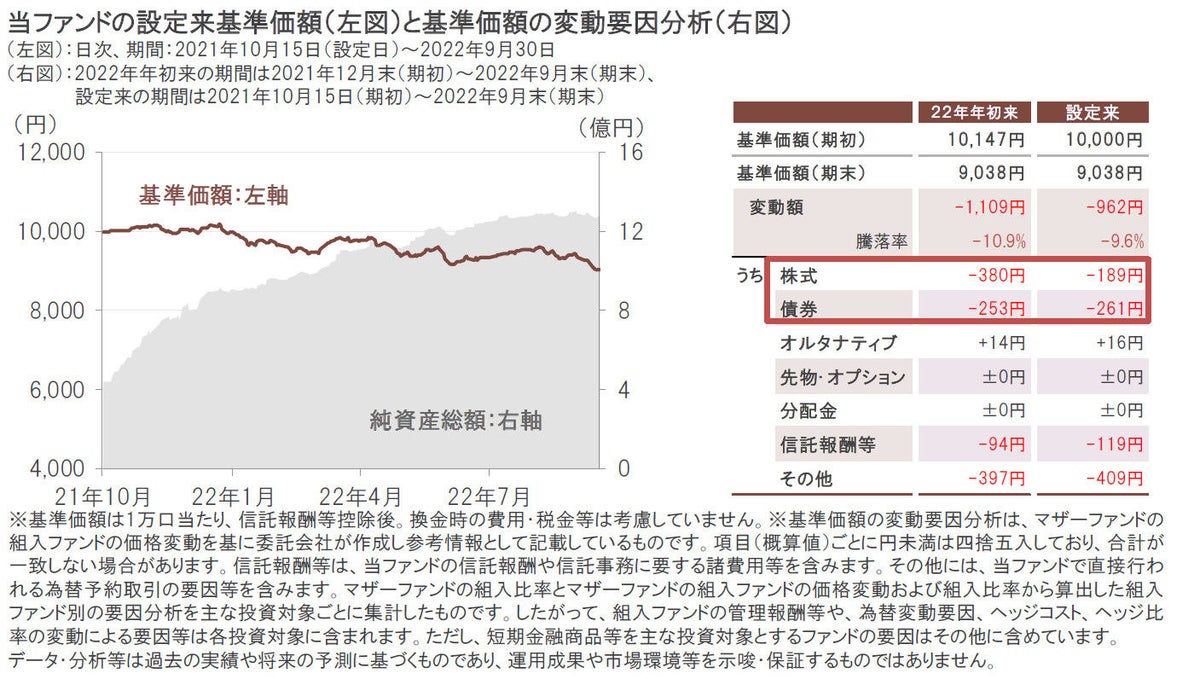 世界の金融市場は2022年年初以降、ロシアによるウクライナへの軍事侵攻といった地政学リスクの台頭に加えて、世界的なインフレや米国をはじめ世界の主要中央銀行による積極的な金融引き締めの動きが強まっていることなどから、大きく変動しています。積極的な金融引き締めの動きを受けて金利が上昇する中で、債券価格は下落しています。また、株式市場も、高バリュエーション(投資価値評価)のグロース銘柄を中心に下落しました。米国国債については、年初から9月末までの下落率が大恐慌期やオイルショック期の同期間より大きくなるなど、未曾有の運用環境に見舞われました。当ファンドでは様々なアセット・クラス(資産)に分散投資を行っていますが、足元のように分散投資効果を得られにくい市場環境下で、設定来(2021年10月15日~2022年9月末)および2022年年初来(2021年12月末~2022年9月末)ともに株式・債券のマイナス寄与が大きく響き、下落となりました。
