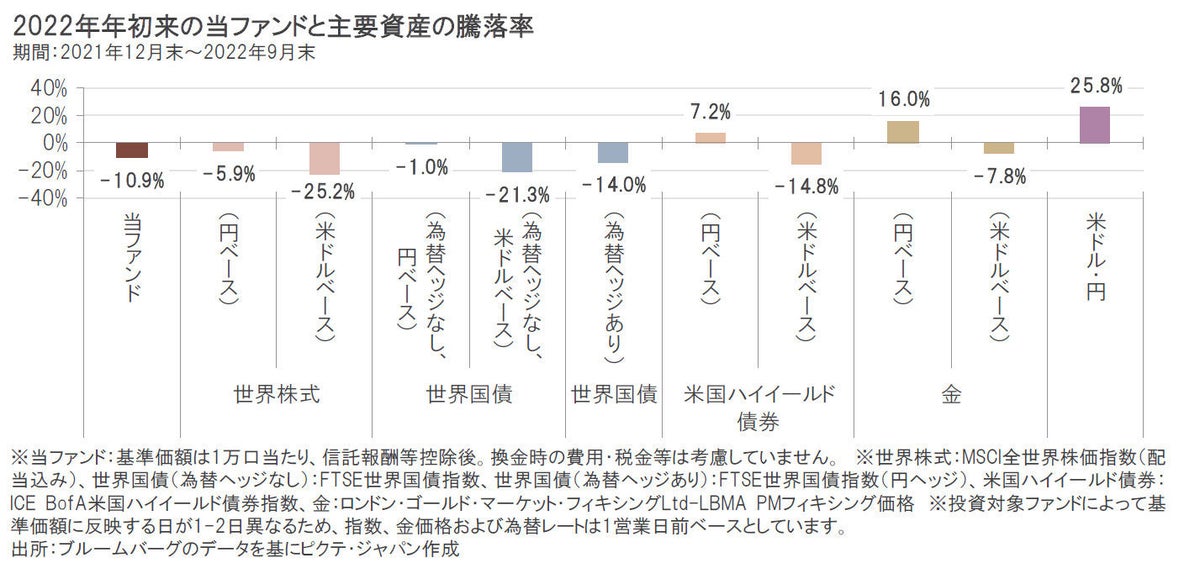 また、為替相場では急速に円安が進行しました。2022年年初来、主要資産の多くが下落していますが、円換算してみた場合には、世界株式や世界国債の下落率は相対的に小幅にとどまり、また、金や米国ハイイールド債券などはプラスのリターンとなるなど、円安によるプラスの効果がありました。