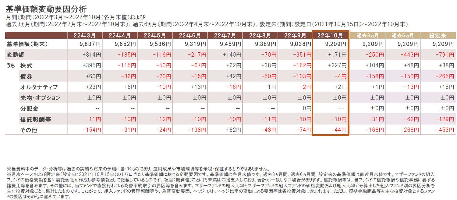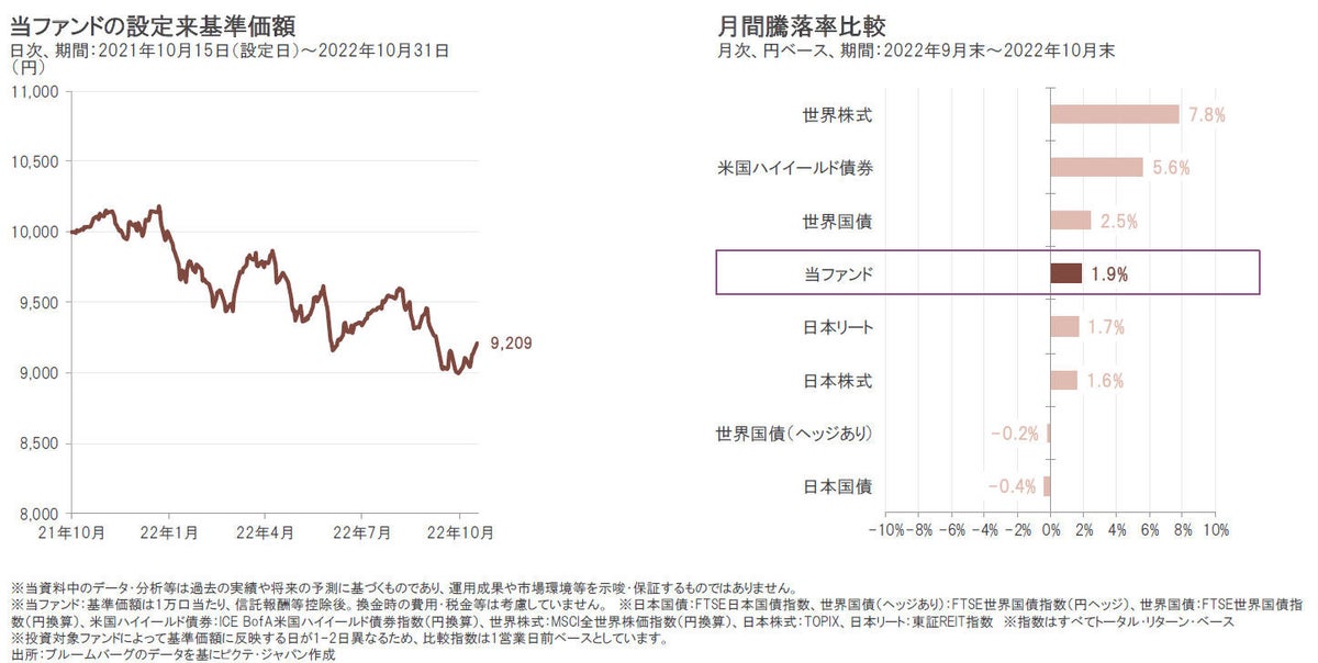 こうした市場環境下、当ファンドの2022年10月31日の基準価額は9,209円、前月末比で+171円 (+1.9%)の上昇となりました。