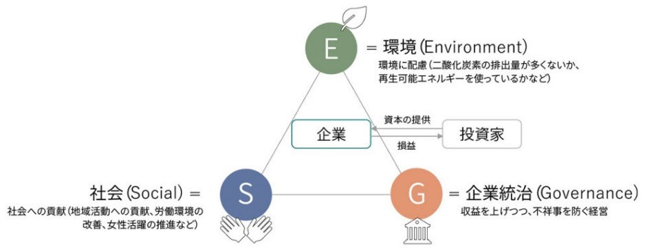 ESGとは、どのようなものなのでしょうか。ESGとは、環境(Environment)、社会(Social)、企業統治(Governance)の英語の頭文字をとったもので、投資の世界で重視されています。環境面では、二酸化炭素排出量の削減、省資源化や再生可能エネルギーの導入等、企業が環境に対する悪影響の軽減に取り組んでいるかなどが考慮されます。次に社会面では、地域活動への貢献、労働環境の改善や女性活躍、多様性の推奨等、より平等で健全な社会の実現に貢献しているかが評価されます。最後に、企業統治面では、取締役会の構成(社外取締役の登用や多様性)やガバナンスの実効性等、収益を上げつつ、不祥事を防ぐ経営を行っているかなどが問われます。
