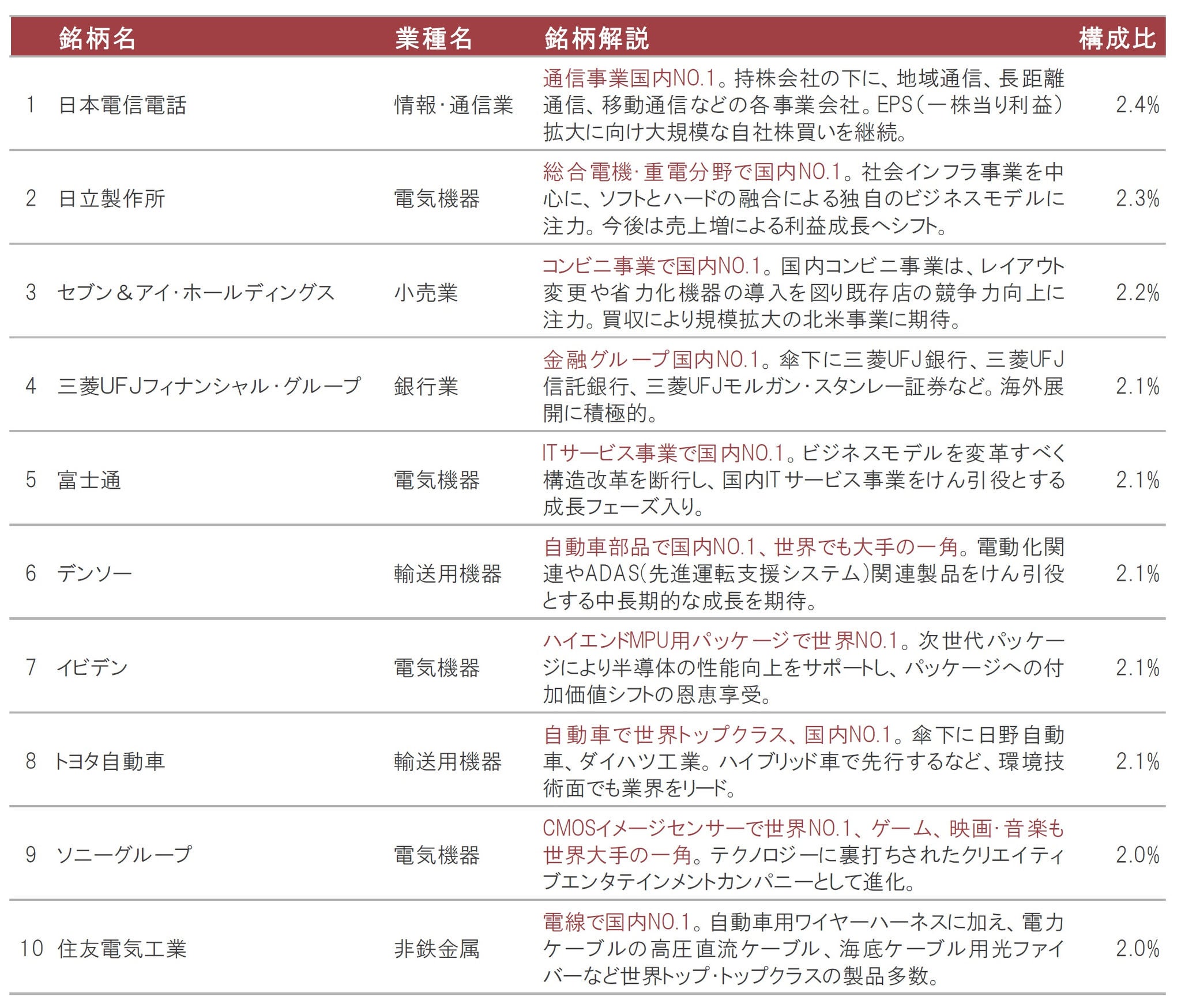 ※表は特定の銘柄の勧誘や売買の推奨等を目的としたものではなく、その価格動向等を示唆するものでもありません。 ※業種は東証33業種分類で表示しています。 ※上記銘柄解説の「NO.1」とは、その分野でのトップシェア(売上高等)を意味します。 ※構成比は実質比率(マザーファンドの組入比率×マザーファンドにおける当該資産の組入比率)です。