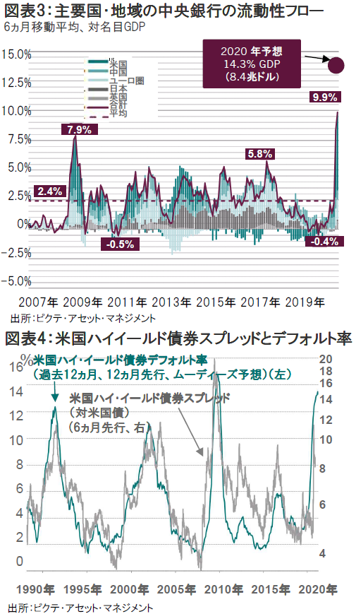 とはいえ、景気回復は未だ初期段階にあり、大統領選や新型コロナウイルス第2波到来の可能性等、先行きに多くのリスクが残ることには留意が必要です。従って、米国ハイイールド債は引き続き警戒すべきとみています。当資産クラスは、ピクテのモデルで測定すると、過去20年の平均に対して唯一割高感の見られないセクターですが、こうしたバリュエーションに将来の債務不履行(デフォルト)の可能性が十分に織り込まれているとは思われません。市場に織り込まれたデフォルト率が僅か7~8%に留まるのに対し、ムーディーズは市場予想のほぼ2倍の13%を予想しています。