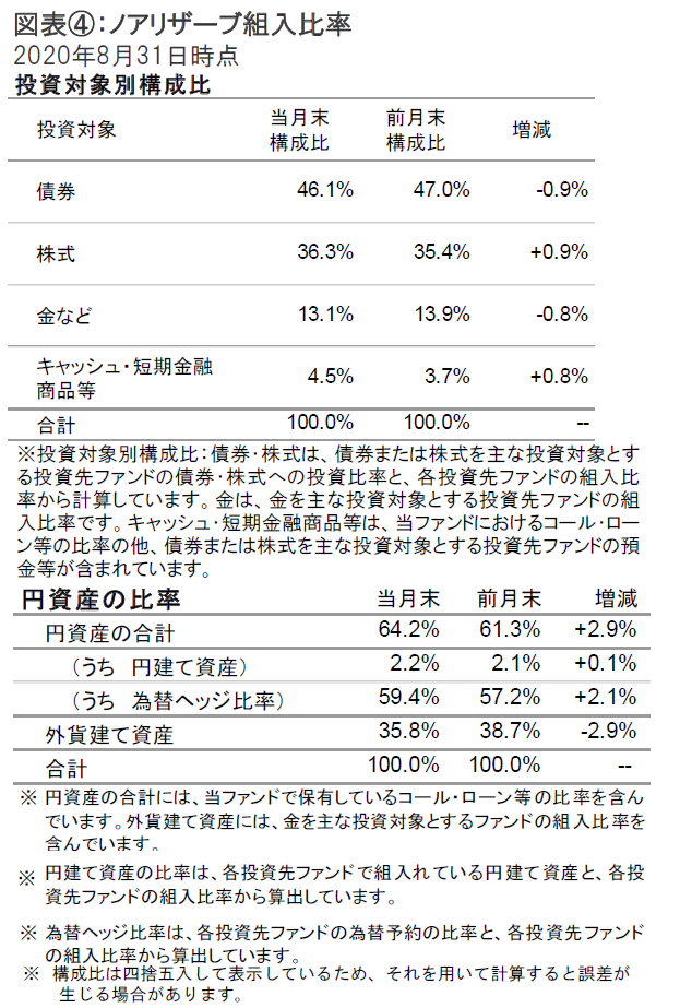 2020年8月のノアリザーブの基準価額(分配金再投資後)は上昇しました。金融緩和策の継続や新型コロナウイルスのワクチン開発への期待、一部の主要経済指標の改善などを背景に株式に資金が流入しました。資産配分では、債券と金の組入れを引き下げ、株の組入れ比率を引き上げました。