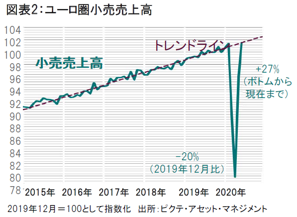 割高感の際立つ米国株式に対しては中立にみています。一方、ユーロ圏株式を選好します。金融緩和ならびに財政拡大の協調政策を背景に、域内経済の先行きが改善しているからです。例えば、ユーロ圏小売売上高は、底値水準から長期トレンド水準へ回復し(図表2参照)、個人向け銀行融資は過去10年で最も強い伸びを示しています。