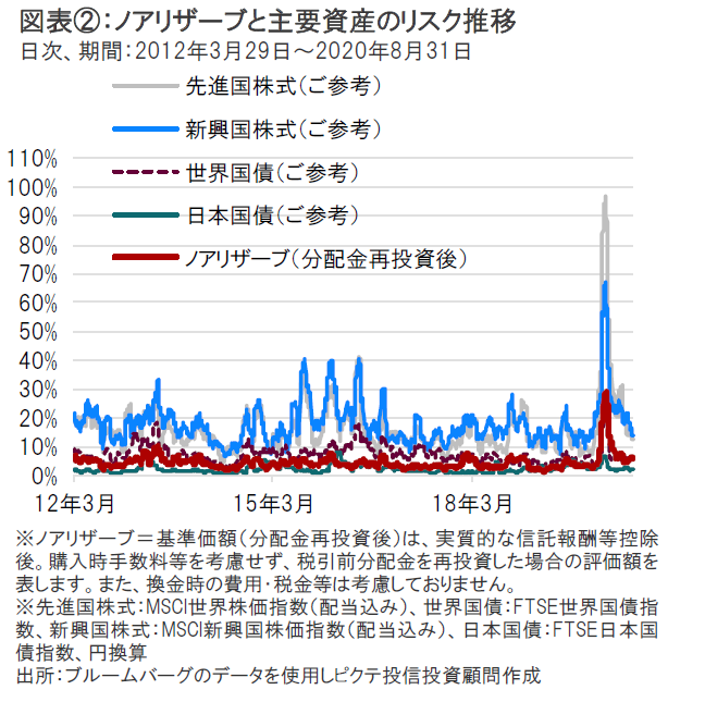 ノアリザーブの設定来のリスクは、株式等と比較すると相対的に低位に推移してきました。当ファンドのリスク(価格変動)水準は、新型コロナウイルスの影響で金融市場の価格変動が大きくなった3月よりも大幅に低下、新型コロナウイルス感染拡大前よりも小幅に高い水準での推移となっています。(図表②参照)