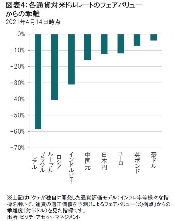 バリュエーション面での魅力が増しつつある米国国債も、先行きが期待されます。米国10年国債利回りは2021年1~3月期中に約80ベーシス・ポイント(0.8%)上昇し、過去の市場で上昇相場に転じた状況に近付いています。更に、市場に織り込まれた金利水準は、エコノミストのコンセンサス予想やFRBの予想水準とほぼ一致しています。従って、10年国債利回りは、1.75%を大きく上回らないと考えており、これ以上の利回り上昇の可能性は低いと考えています。米国国債利回りは、安定して推移するにしても、低下に転じるにしても、他の主要国の国債利回りを上回って推移するものと思われ、利回り格差が殆どの通貨に対するドル高に繋がると考えています。一方で、中長期的にはドル安が進行するとの見方は変わりません。
