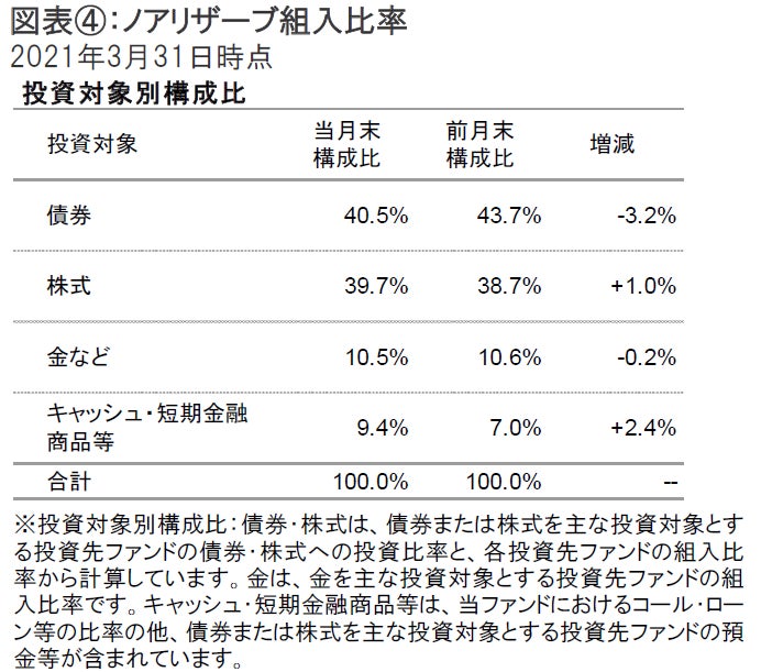2021年3月31日のノアリザーブの基準価額は、前月末比で-4円の9,371円となりました。同期間の主な変動要因は、株式が-26円、債券が-26円、金が-17円、為替が+95円、分配金が-20円でした。基準価額(分配金再投資後)は前月末比+0.17%の上昇となっています(図表①参照)。なお、円資産の比率は、前月末より低下し、56.9%となりました。