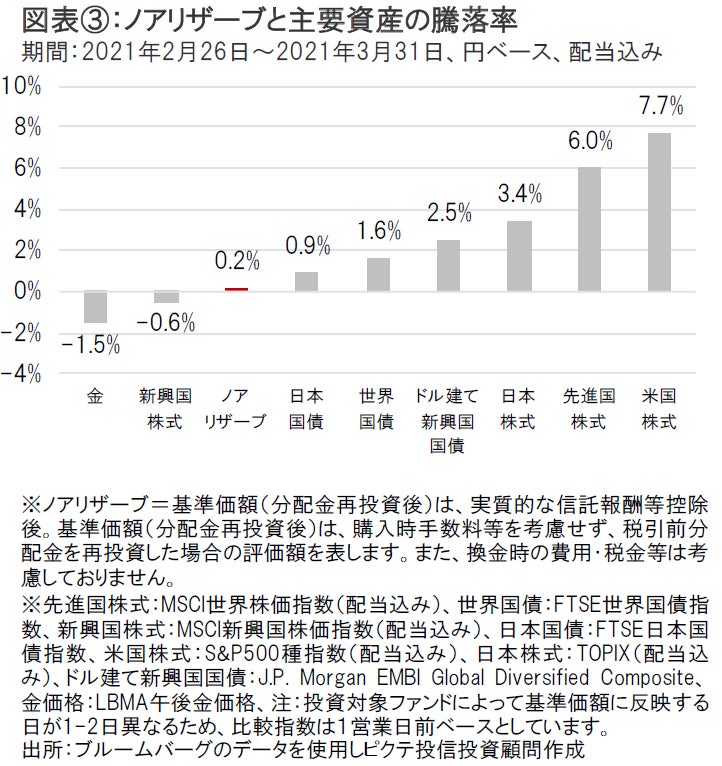 このような状況下、ノアリザーブの基準価額(分配金再投資後)は小幅ながら上昇しました(図表③参照) 。