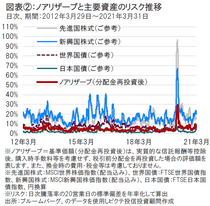 ノアリザーブの設定来のリスクは、株式等と比較すると相対的に低位に推移してきました。当ファンドのリスク(価格変動)水準は、新型コロナウイルスの影響で先行き不透明感が高まった2020年3月に急上昇しましたが、足元ではほぼ新型コロナウイルス感染拡大前の水準まで低下しています(図表②参照)。