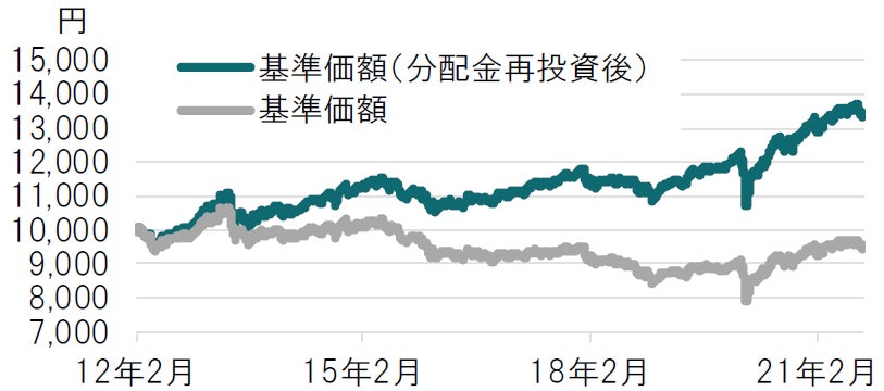 ※基準価額は、1万口あたりで表示しています。※基準価額は、実質的な信託報酬等控除後。基準価額(分配金再投資後)は、購入時手数料等を考慮せず、税引前分配金を再投資した場合の評価額を表します。また、換金時の費用・税金等は考慮しておりません。