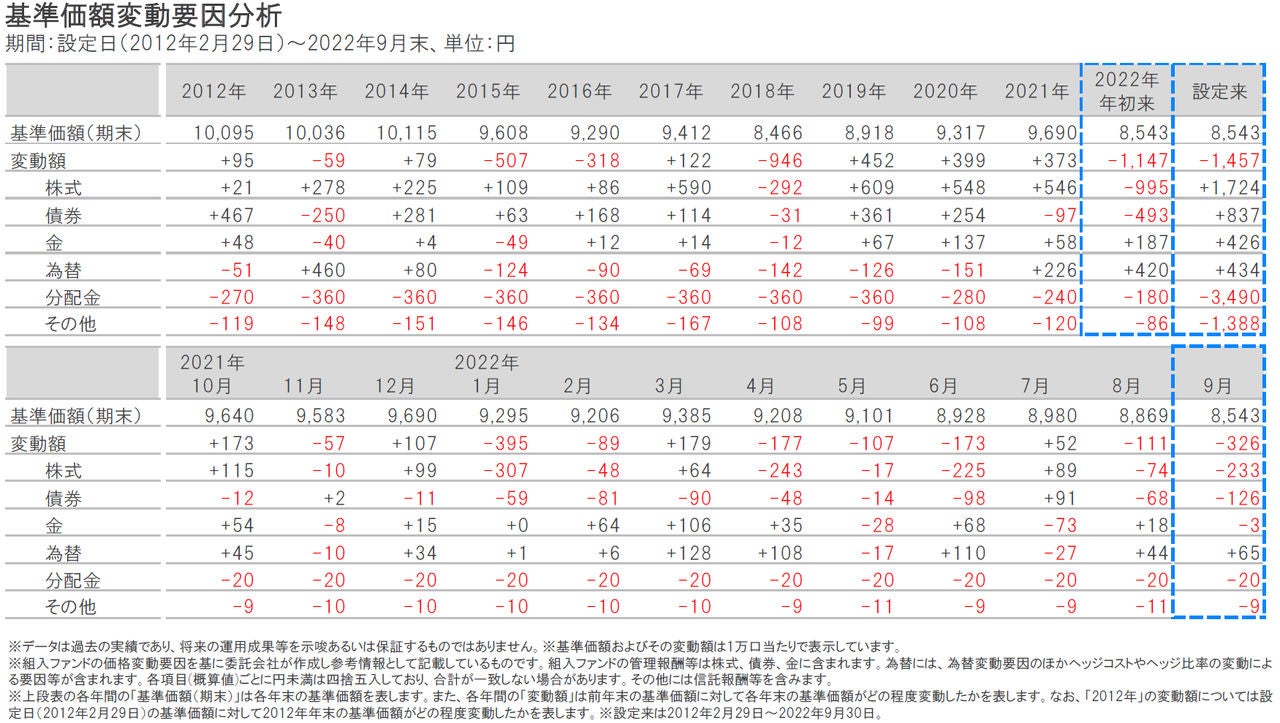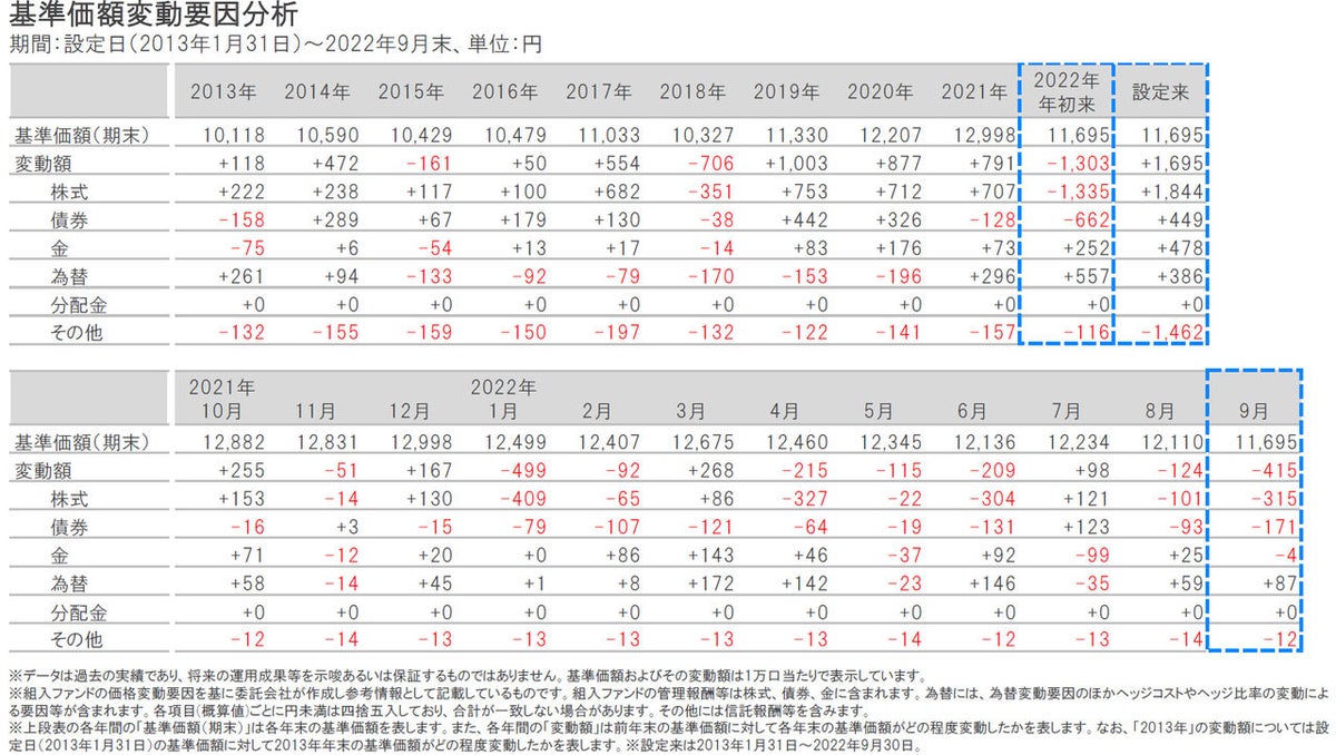 2022年9月は為替がプラス寄与となった一方、株式、債券、金がマイナス寄与となりました。また設定来では、株式、債券、金、為替ともにプラス寄与となっています。