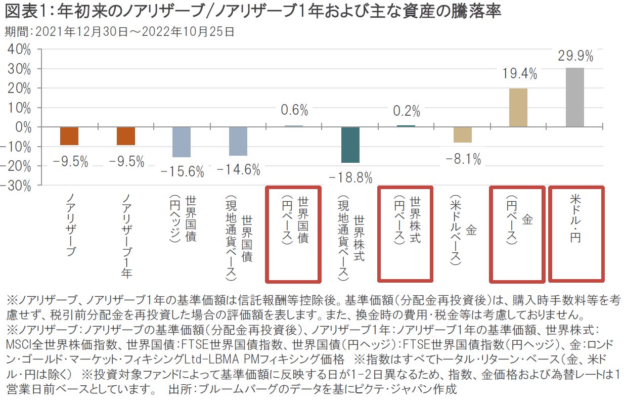 そのため、世界の株式、債券、金などの資産に分散投資を行うことでリスクの低減を図りつつ安定したリターンの獲得を目指すノアリザーブ/ノアリザーブ1年にとっても、2022年の運用環境は分散投資の効果が発揮されにくい厳しい局面となっています。
