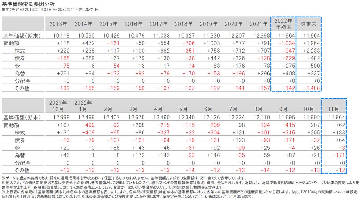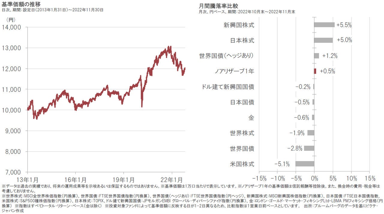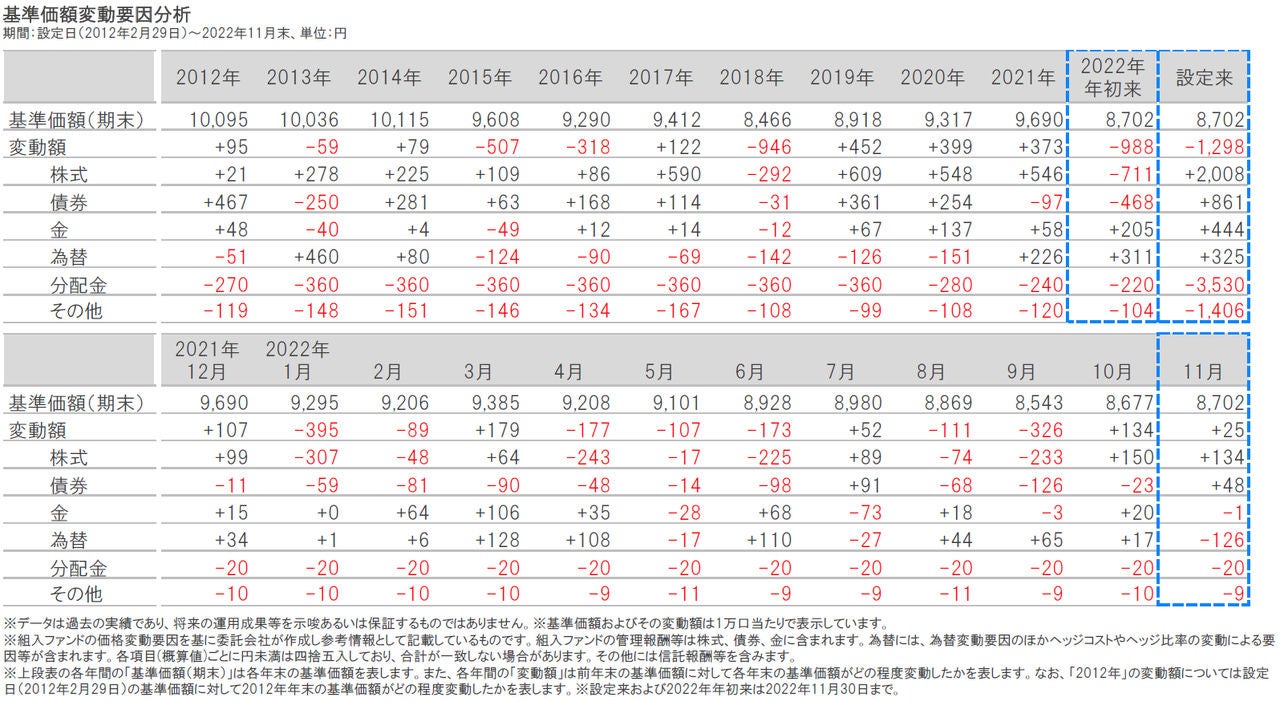 2022年11月は株式、債券がプラス寄与となった一方、金、為替がマイナス寄与となりました。また設定来では、株式、債券、金、為替ともにプラス寄与となっています。
