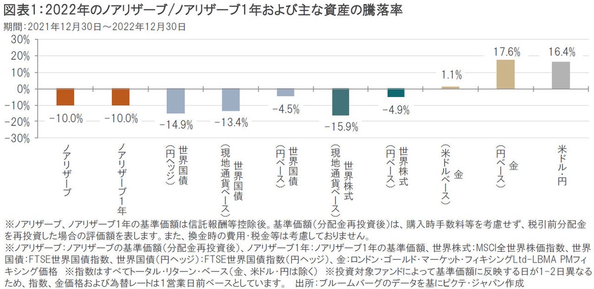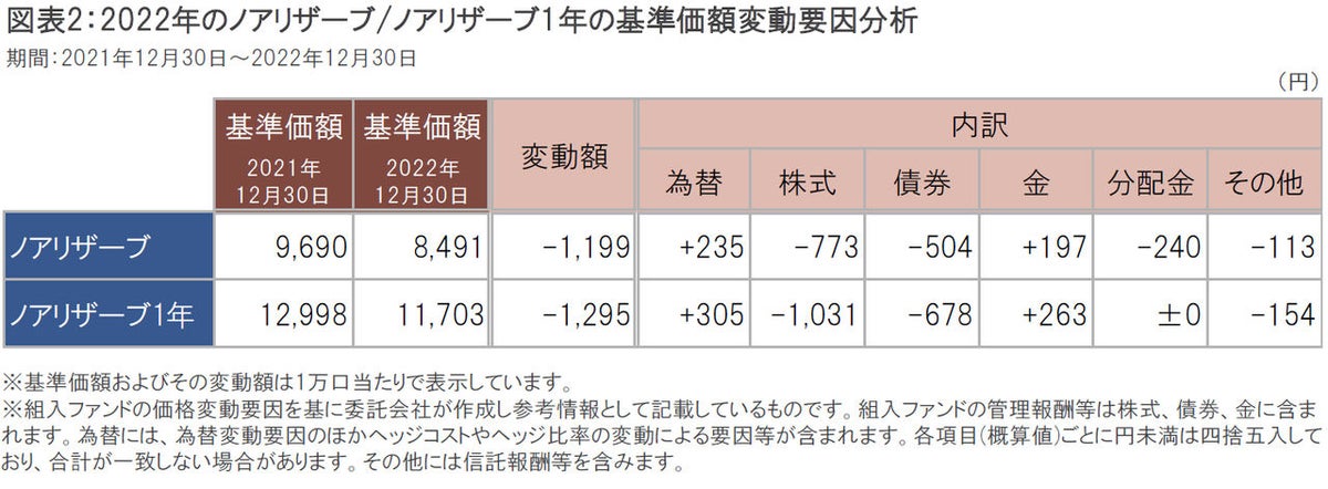 ノアリザーブの基準価額(分配金再投資後)の2022年の騰落率は-10.0%となりました。またノアリザーブ1年の基準価額の2022年の騰落率も-10.0%となりました(図表1参照)。