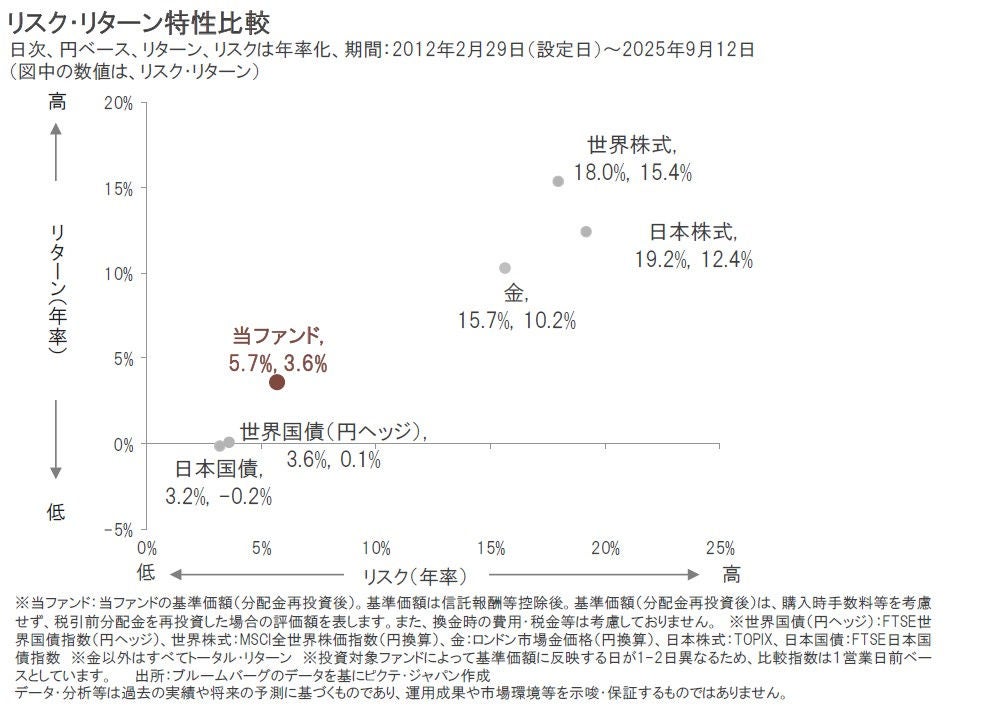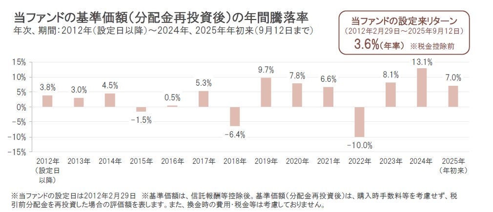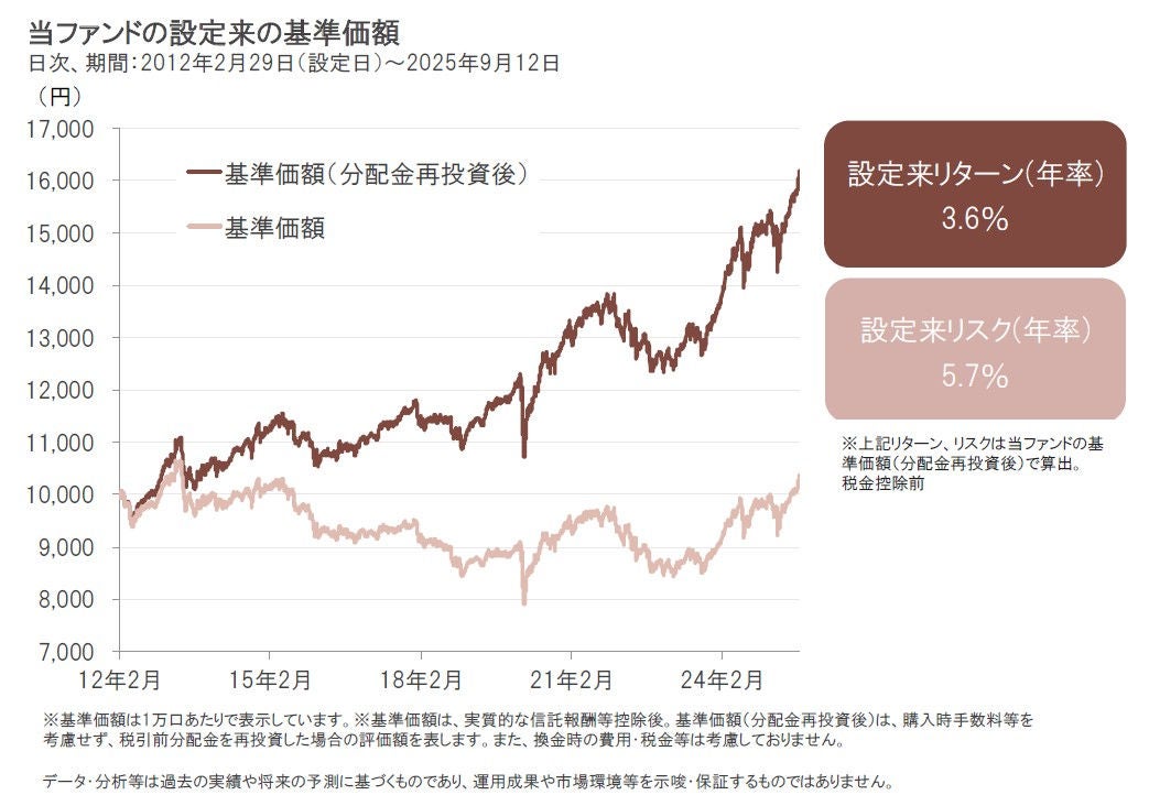 設定来、2025年9月12日までの、当ファンドの基準価額(分配金再投資後)で算出したリターンは+3.6%(年率)、リスクは5.7%(年率)となりました。