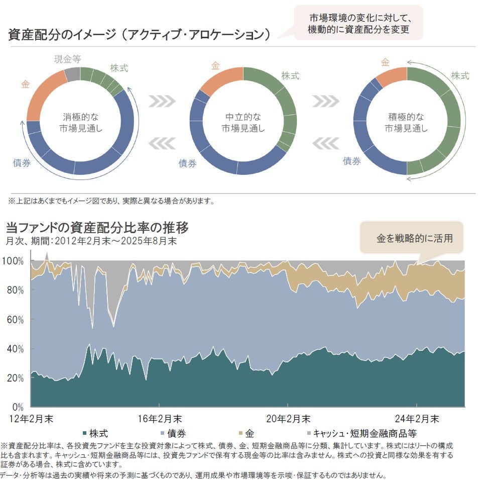 ●株式・債券といった伝統的な資産クラスだけでなく、金にも投資する、アクティブ・バランスファンド