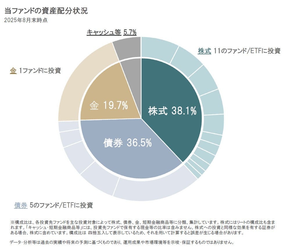 注:円資産の比率(概算値)は、円建て資産と円ヘッジの外貨建て資産の合計です。円建て資産は、当ファンドで保有しているコール・ローン等と各投資先ファンドを通じて実質的に保有している円建て資産です。円ヘッジの外貨建て資産は、各投資先ファンドを通じて実質的に保有している外貨建て資産のうち円で為替予約をしている部分になります。なお、外貨建て資産には株式や債券等のほか金も含まれます。
