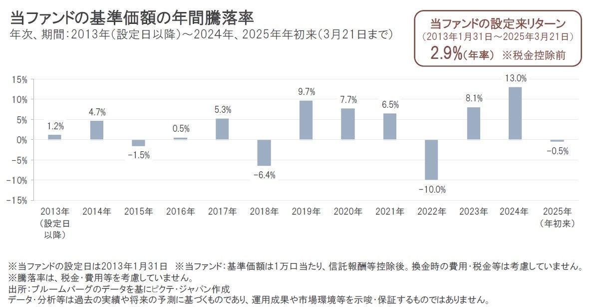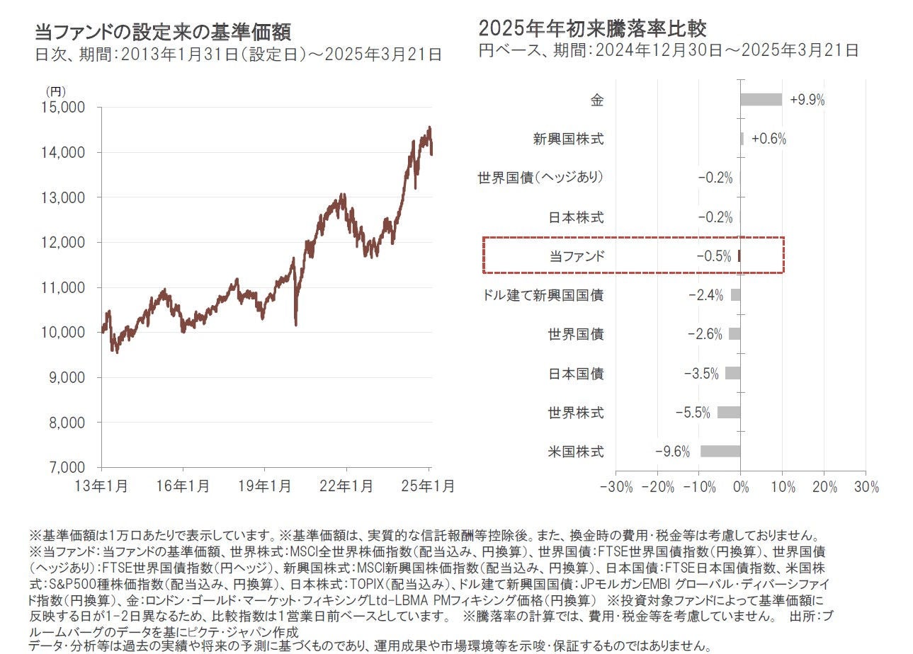 2025年年初来のピクテ・アセット・アロケーション・ファンド(1年決算型)(以下、当ファンド)の基準価額は、3月21日までで-0.5%となりました。ただし、当ファンドは株式だけではなく様々な資産に分散投資を行っていることから、世界株式が大きく下落するなかで、下落率は小幅に抑えられています。