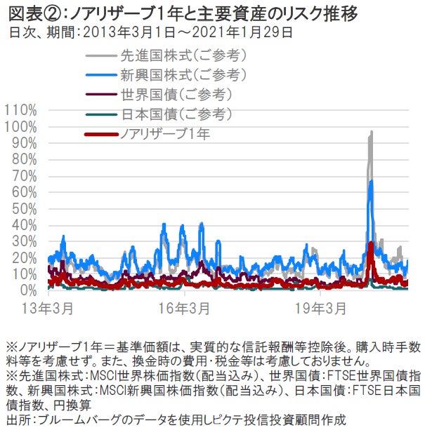 ノアリザーブ1年の設定来のリスクは、株式等と比較すると相対的に低位に推移してきました。当ファンドのリスク(価格変動)水準は、新型コロナウイルスの影響で金融市場の価格変動が大きくなった3月以降、高い水準にありましたが、足元ではほぼ新型コロナウイルス感染拡大前の水準まで低下しています(図表②参照)。