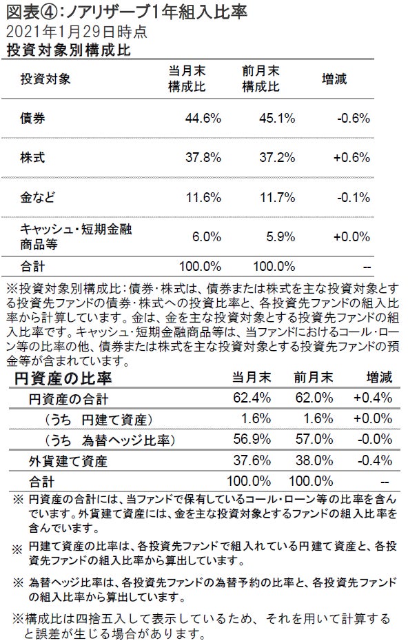 2021年1月29日のノアリザーブ1年の基準価額は、前月末比で+131円の12,338円となりました。同期間の主な変動要因は、株式が+141円、債券が-15円、金が-6円、為替が+23円でした。基準価額は前月末比+1.07%の上昇となっています(図表①参照)。なお、円資産の比率は、前月末より上昇し62.4%となりました。