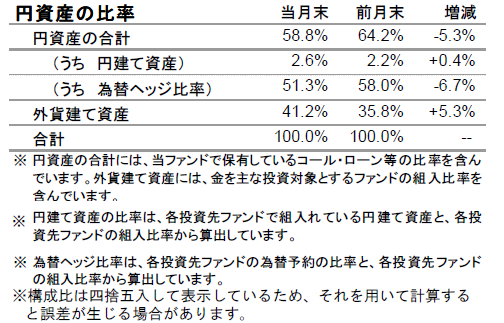 なお、円資産の比率は、為替ヘッジをしている資産の比率を引き下げた一方、外貨建て資産の比率を高めたことなどから前月末より低下し58.8%となりました。